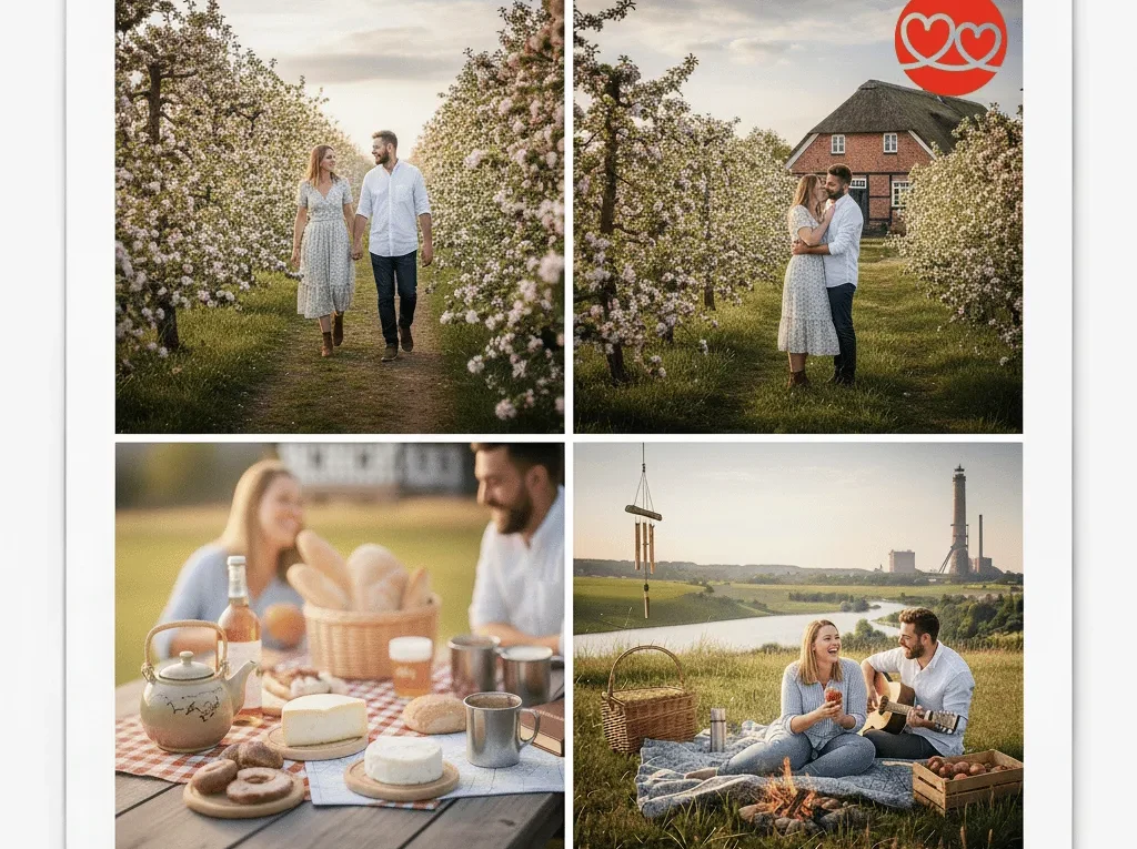 Es gibt kaum einen romantischeren Ort in Norddeutschland als das **Alte Land** zur **Apfelblüte** oder **Kirschblüte**. Ein gemeinsamer Spaziergang durch die rosa-weiße Pracht, zum Beispiel rund um **Jork**, ist das perfekte Date. Die Luft ist erfüllt vom Summen der Bienen und dem süßen Duft. Es ist entschleunigt, traumhaft schön und bietet eine unvergleichliche Atmosphäre für tiefe Gespräche. Packt einen Picknickkorb ein und sucht euch einen ruhigen Platz unter einem blühenden Baum. - Aktiv am Wasser: Radtour auf dem Elbdeich mit „Pötte gucken“
